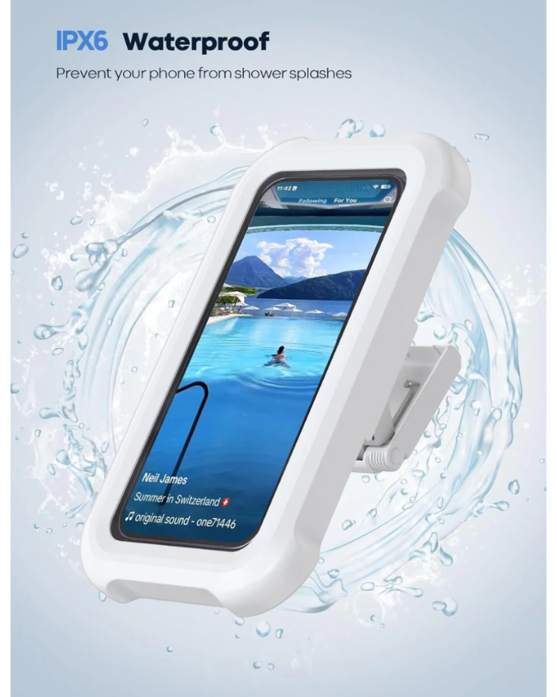 حامل الهاتف المقاوم للماء بزاوية 480° هو الحل الأمثل لمشاهدة محتوىك المفضل أثناء الاستحمام، مع حماية كاملة وسهولة في التركيب والتعديل.